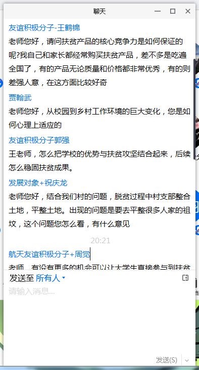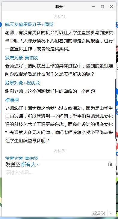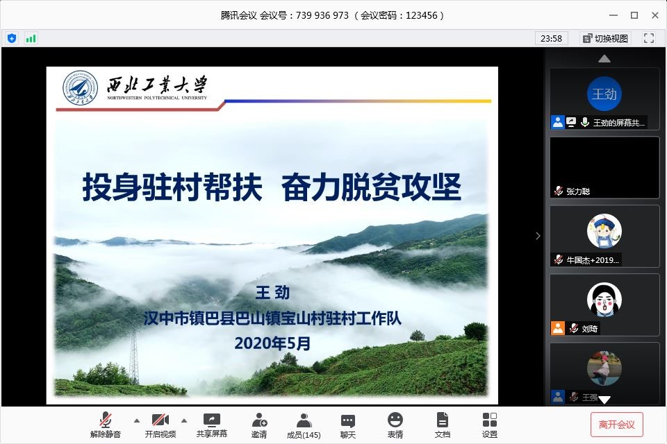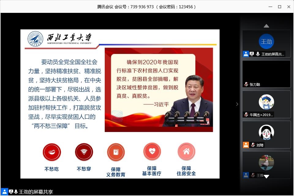 王劲从驻村工作情况、疫情防控措施和青年学子与脱贫三个方面进行了分享与交流。在驻村工作中,王劲因地制宜、因人制宜,不断适应学习,完成了从学校到乡村工作角色的转变。立足于本村实际,制定了“红色教育+国防教育+消费扶贫”的脱贫攻坚发展路线。不仅如此,王劲还有效利用西工大优质科教资源组织开展暑期支教、社会实践等多样化教育帮扶形式,阻断贫困代际传递。在新冠肺炎疫情防控工作中,充分发挥农村基层组织和党员的先锋模范作用,设立检查站严防疫情输入;利用微信、抖音等网络媒介进行防控宣传;落户到人,做好登记等。最后,王劲就“青年学子与扶贫”的话题发表了自己的看法:青年一代是具有创造力和想象力的一代,是打赢脱贫攻坚战的主力军,需要不断地在生产活动和社会实践中励练自己,正所谓“拔节抽穗,培根铸魂正当时”。