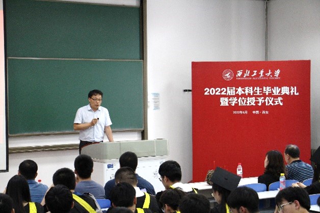 李广宁老师作为班主任代表发言,李老师结合《空气动力学》课程,将学生的成长成才过程类比为气动外形的优化,动力系统的加强,飞行阻力的减少,稳定性和操纵性的权衡,祝愿学生行稳致远,真正成为手可摘星辰的星际航行者。