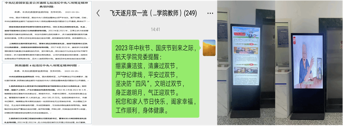 党委坚守节点,做好纠“四风”树新风工作,下发了近期中央纪委国家监委公开通报的违反中央八项规定精神典型问题、陕西省纪委监委公开通报的违反中央八项规定精神典型问题等案例开展学习,向党员领导干部、全体党员发送“中秋节、国庆节党风廉洁提醒”短信,在学院电子屏播放“@全体党员干部,这份清廉过节指南请查收”、“清廉家风丨有国才有家”等教育警示图片和视频,营造清廉过节的浓厚氛围,增强遵守党纪国法意识,夯实干事创业思想基础。