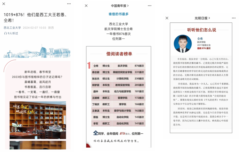 除此之外,仝希同学还是西工大图书馆2023年借阅图书最多的人,被西北工业大学、中国青年报、光明日报等多个官微所报导。他也向同学们分享了自己阅读文献的经验与感想,第一,集百家所长。第二,相同点相互对照。第三,不同点积极延伸。第四,课本中的示例勤于验算。第五,快速且有重点地阅读。