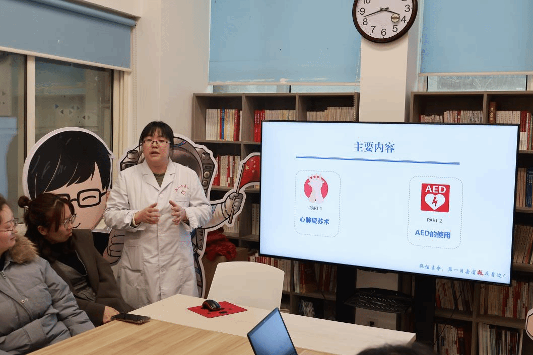 责任医师汤燕做了题为《急救知识与技能培训》的报告,详细为教职工讲解了心肺复苏术的操作方法与要点,并对自动体外除颤仪(AED)的使用方法进行示范。校医院助教员现场演示了单人心肺复苏、双人心肺复苏及AED的使用方法,指导进行分组分步骤的强化练习。