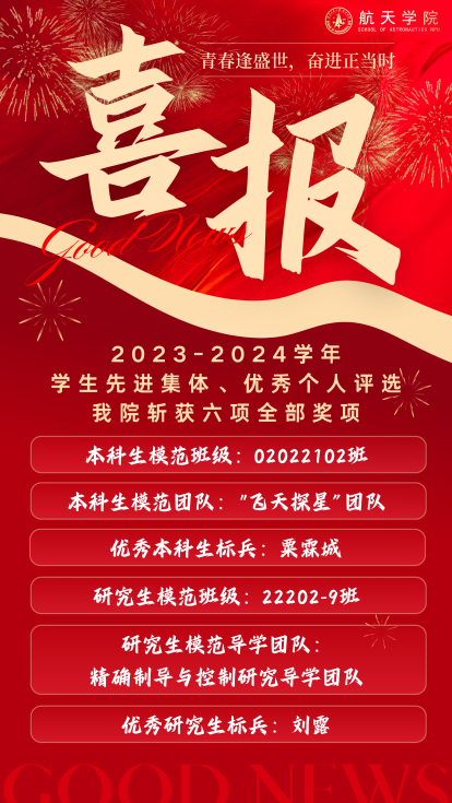 各班级、团队和学生个人砥砺奋进,追求卓越,以努力成为专业精、系统强、重实践、能担当的“总师型”人才为目标。经过6场激烈角逐,实现了本科生模范班级、本科生模范团队、优秀本科生标兵、研究生模范班级、研究生模范导学团队、优秀研究生标兵这6项重量级荣誉的全满贯,这也是学院首次在该项评比中取得大满贯。他们用青春奔赴星辰大海,用行动践行初心如磐,下面让我们一起见证他们的青春风采吧!