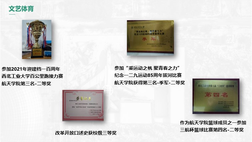 所获荣誉:学分积排名18/262,综合测评排名20/262。社会服务方面,曾担任班级文体委员,组织班级在大类的小班篮球赛中获得第四名的成绩;参与图书馆志愿服务,获得优秀志愿者称号,志愿时长累计78小时。文艺体育方面,作为成员参加2021年建党一百周年百公里接力跑,学院获得第三名;参加“乘运动之帆 聚青春之力”纪念一二九运动85周年拔河比赛,学院获得第三名;参加三航杯篮球比赛,学院获得第四名。校园活动方面,曾获“四史”答题竞赛一等奖、火箭放飞大赛二等奖、党史竞赛二等奖、“鸡蛋撞地球”二等奖等。学科竞赛方面,获得全国大学生数学竞赛一等奖、“互联网+”校赛三等奖等。