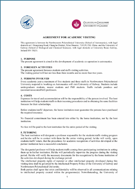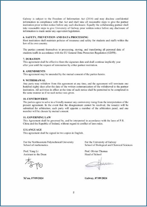 与高威大学生物与化学学院签署院级学生联合培养协议。以下为两校学生联合培养协议成人电影与末页。