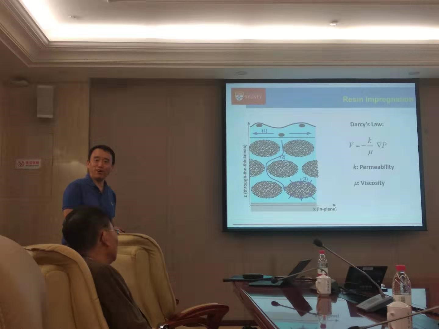 Ye Lin教授首先向参会者介绍了悉尼大学在学术和学生培养等方面与国内的合作情况,并欢迎西北工业大学的师生前往悉尼大学进行交流和深造。接下来,Ye Lin教授报告了纤维增强复合材料在当前发展中遇到的机遇和挑战,以及他对这些问题的思考和展望。纤维增强树脂基复合材料具有优异的比强度和比刚度,在航空航天、绿色能源和远洋运输等行业中具有广泛应用。过去半个世纪以来,通过对增强纤维、树脂基体以及两者间界面性能的不断优化,复合材料的性能得到了长足的进步。近年来,纳米增强材料(如石墨颗粒、碳纳米管)的引入进一步提高了复合材料的性能,并赋予材料新的功能性(如自感知、自修复等)。报告深入浅出地介绍了在解决先进复合材料的“加工-结构-性能关系”这一核心主题的发展历程,并分析了先进复合材料结构在向自感知和自修复等新功能发展中面临的关键问题和挑战。Ye Lin教授幽默风趣、博学多闻、温文儒雅的报告赢得在场师生的阵阵掌声。最后,在提问互动环节,Ye Lin教授针对与会人员提出的复合材料制造工艺、性能预示和破坏判据等热点问题进行了专业解答。