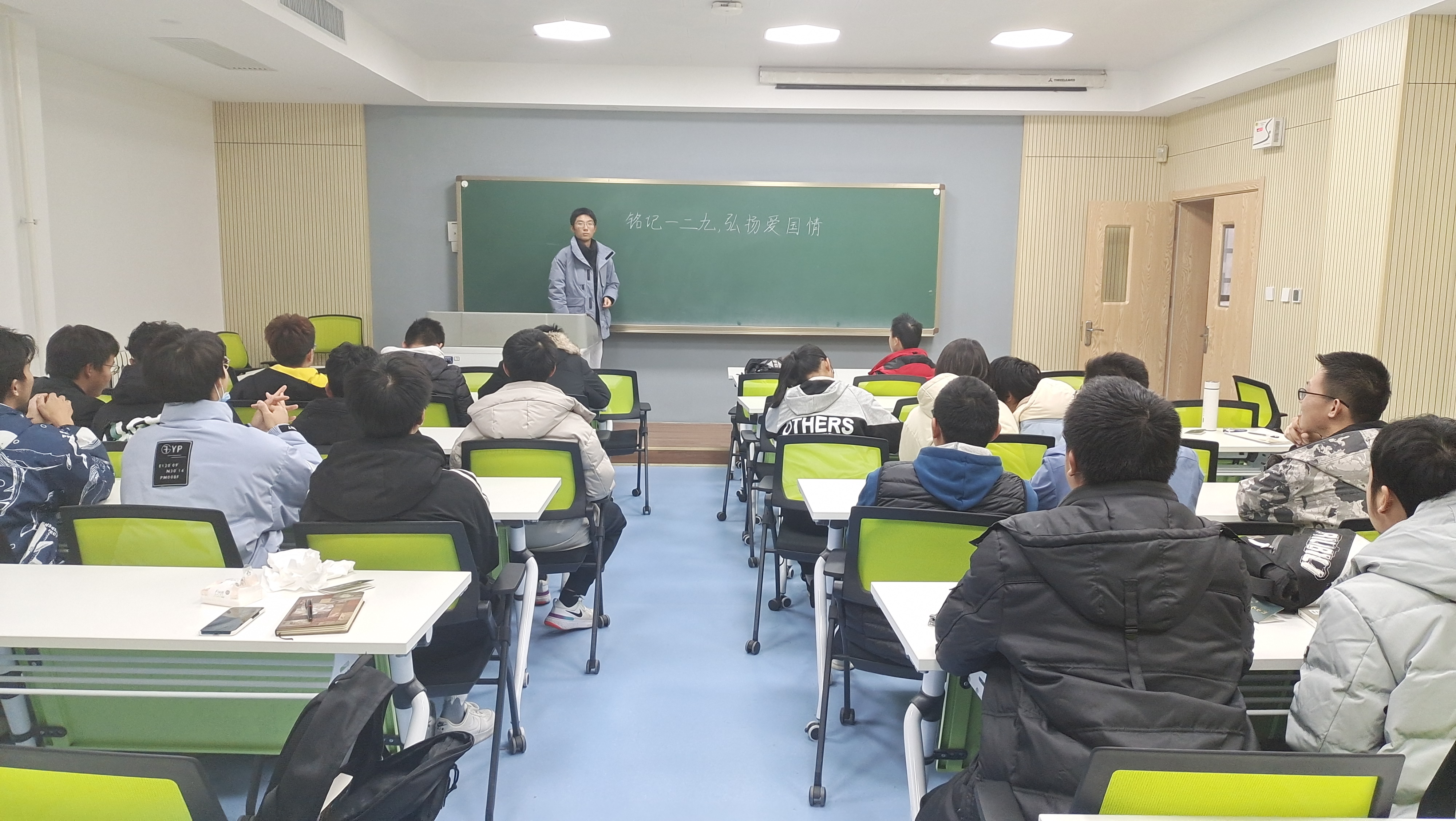 活动伊始,班长陈家骏给大家讲述“一二·九”运动的历史背景及其意义,跟随着班长的讲述,大家似乎又回到了85年前烽烟四起的中华大地,无数先辈们逆流而上,发出旷古烁金的的呼声——“华北之大已经安放不得一张平静的书桌了!”12月12日恰逢西安事变84周年,“停止内战,一致对外”的“一二·九”口号更加深入人心。忘记国家民族的屈辱历史等于背叛过去,一幕幕旧日场景铺展在眼前,同学们在震撼中更受鞭策。