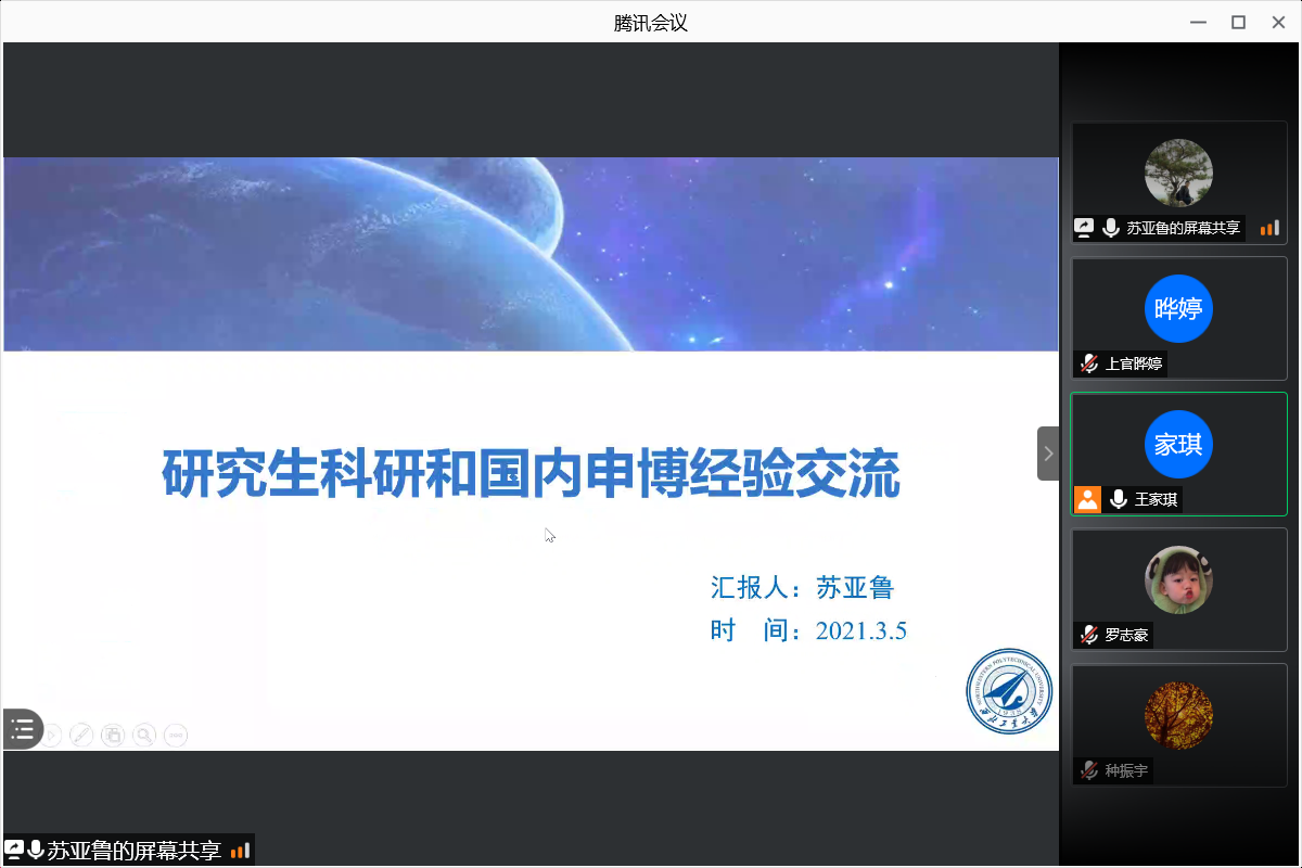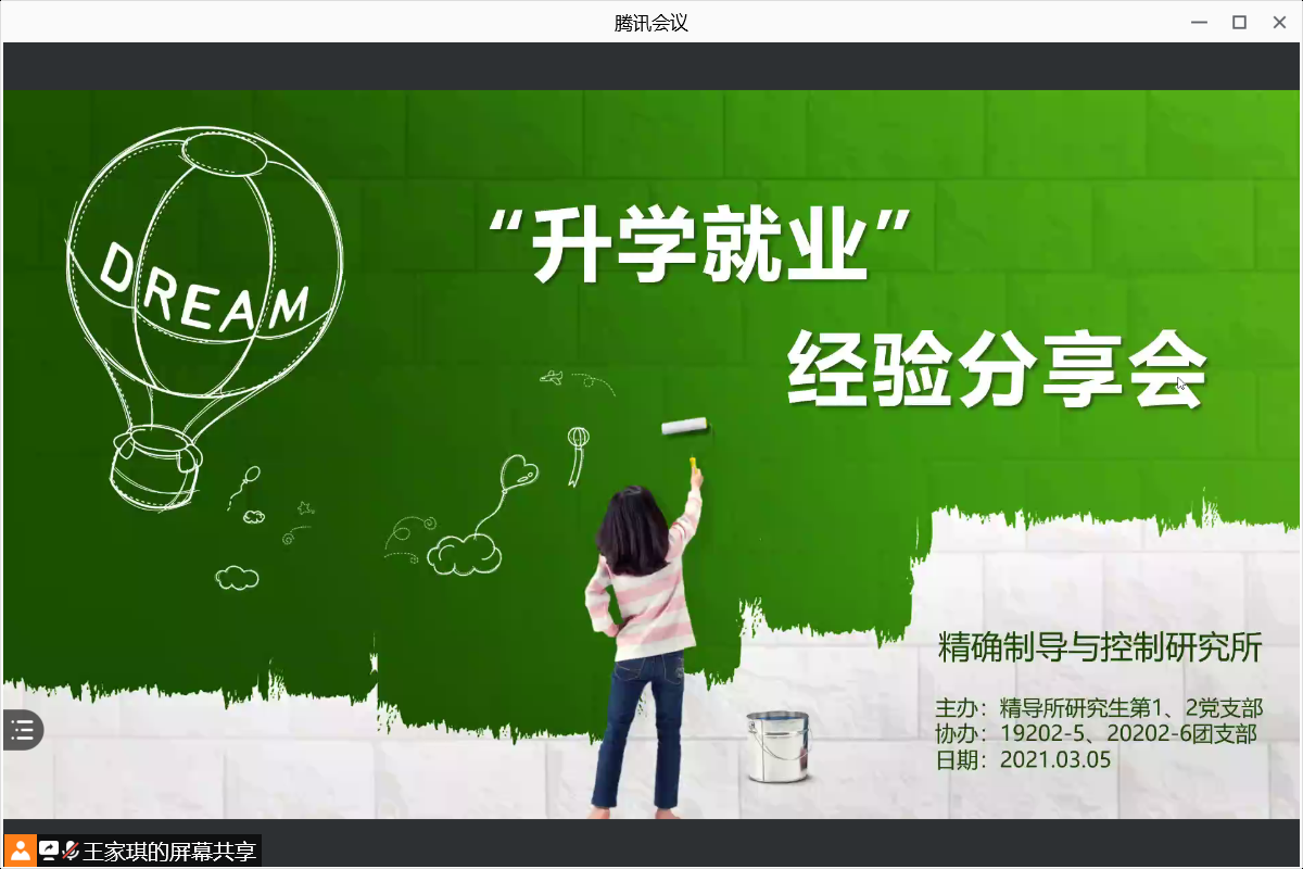 3月5日晚,成人电影 精确制导与控制研究所在腾讯会议举办以“升学就业”为主题的经验分享会。本次活动由成人电影 精确制导与控制研究所研究生第一、二党支部主办,19202-5、20202-6团支部协办,精导所学习委员王家琪主持会议,精导所2019级、2020级全体硕士生参加会议。