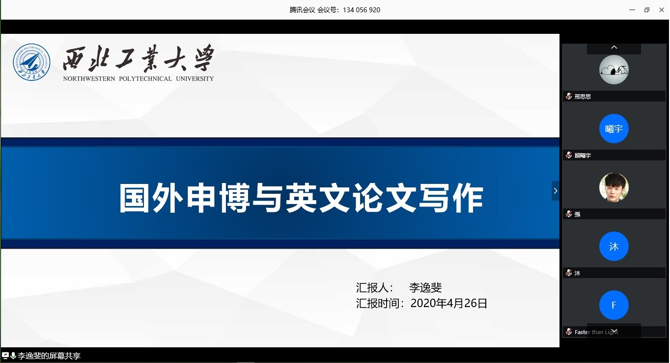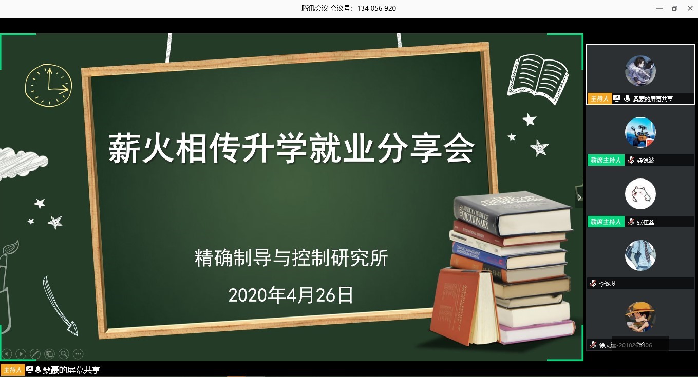 2020年4月26日上午,精确制导与控制研究所“薪火相传”升学就业分享会在腾讯会议举行。本次活动由精导所研究生第一党支部和第二党支部策划主办、18202-5团支部和19202-5团支部协办,旨在为在读研究生提供一个相互学习、交流的机会,帮助大家对就业升学有更清晰的认识。本次活动邀请了四位2020届硕士毕业生代表分享他们升学就业的经历,分别是走向工作岗位的张慧、熊瑜,和选择升学读博的李逸斐和马清文。