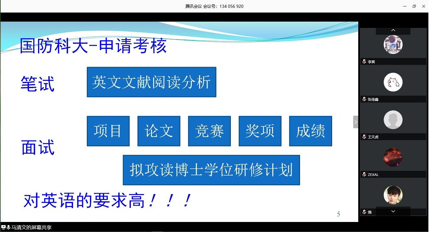 马清文师兄毕业后即将去国防科技大学继续攻读博士学位,他从如何联系导师、如何应对面试等方面,为大家讲解了国内升学读博需要注意的事项;同时分享了自己对读博与就业的思考,让大家对读博与工作的选择有了更清晰的认识。