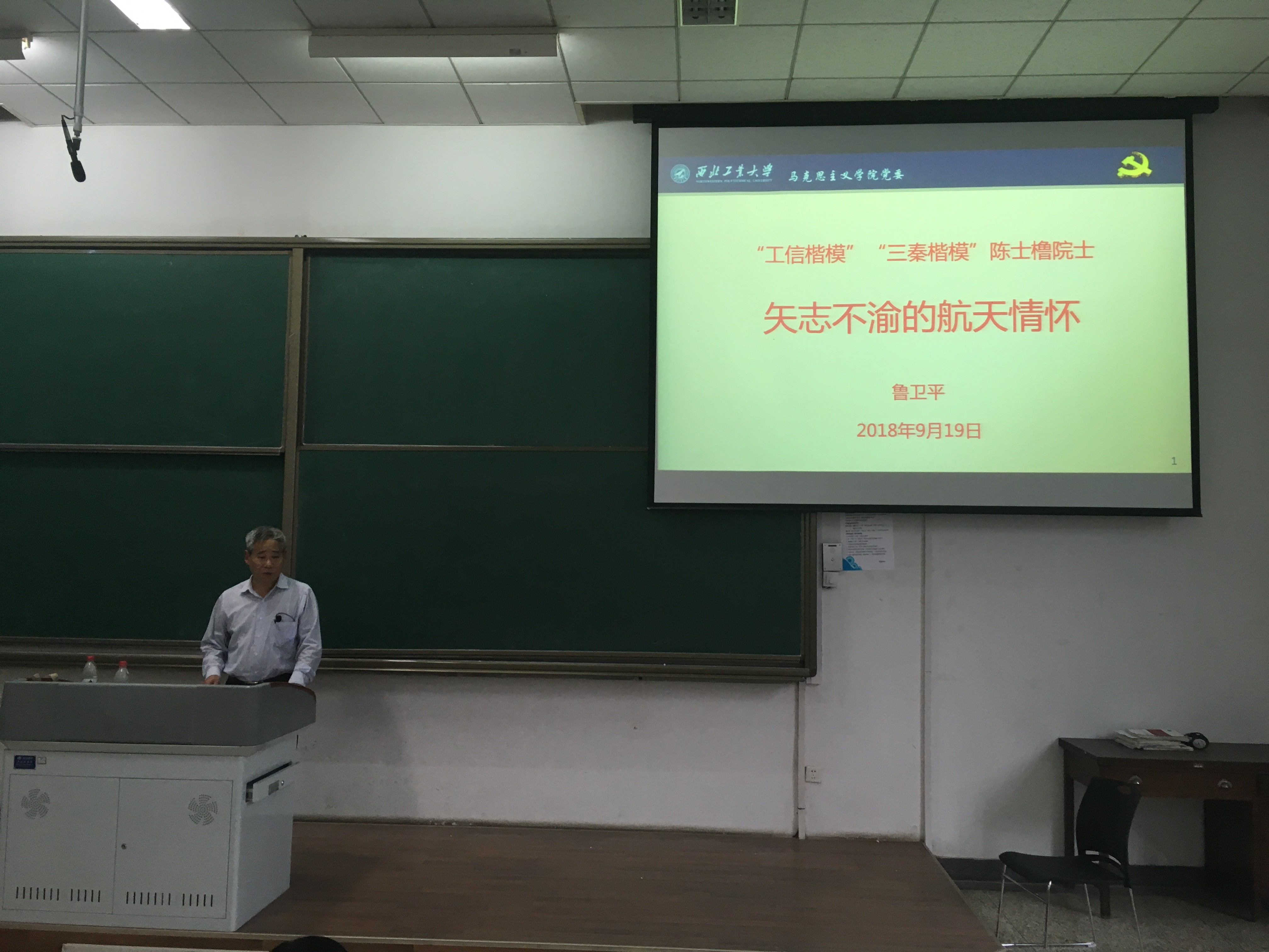 在长安校区教学西楼D-101举行2018级本科生新生缅怀陈士橹院士报告会,邀请马克思主义学院鲁卫平老师做“矢志不渝的航天情怀”为主题的报告。181名新生参加本次活动。报告会由2018级本科生辅导员程昊宇老师主持。