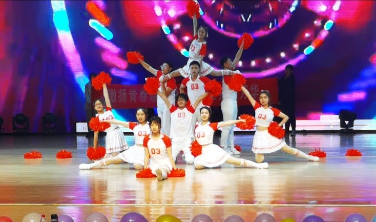 比赛中,“飞天逐梦”队出场时,“天院加油”的呐喊声响彻全场。伴随着背景音乐与同学们的助威声,健美操队员们怀揣着热情,充满了自信,进入了比赛场地。他们的舞姿娴熟自然,舞蹈的节奏与音乐的律动融合恰到好处,每一个眼神的传递,每一次动作的交换,相互之间的默契天衣无缝。当屏幕背景不断变化时,队员们仿佛与屏幕背景、与音乐融为一体,他们已经全身心的投入到了这场视听盛宴之中。队员们的舞蹈也勾起了观众们舞动的心,所有观众不禁为之沉醉、为之呐喊。
